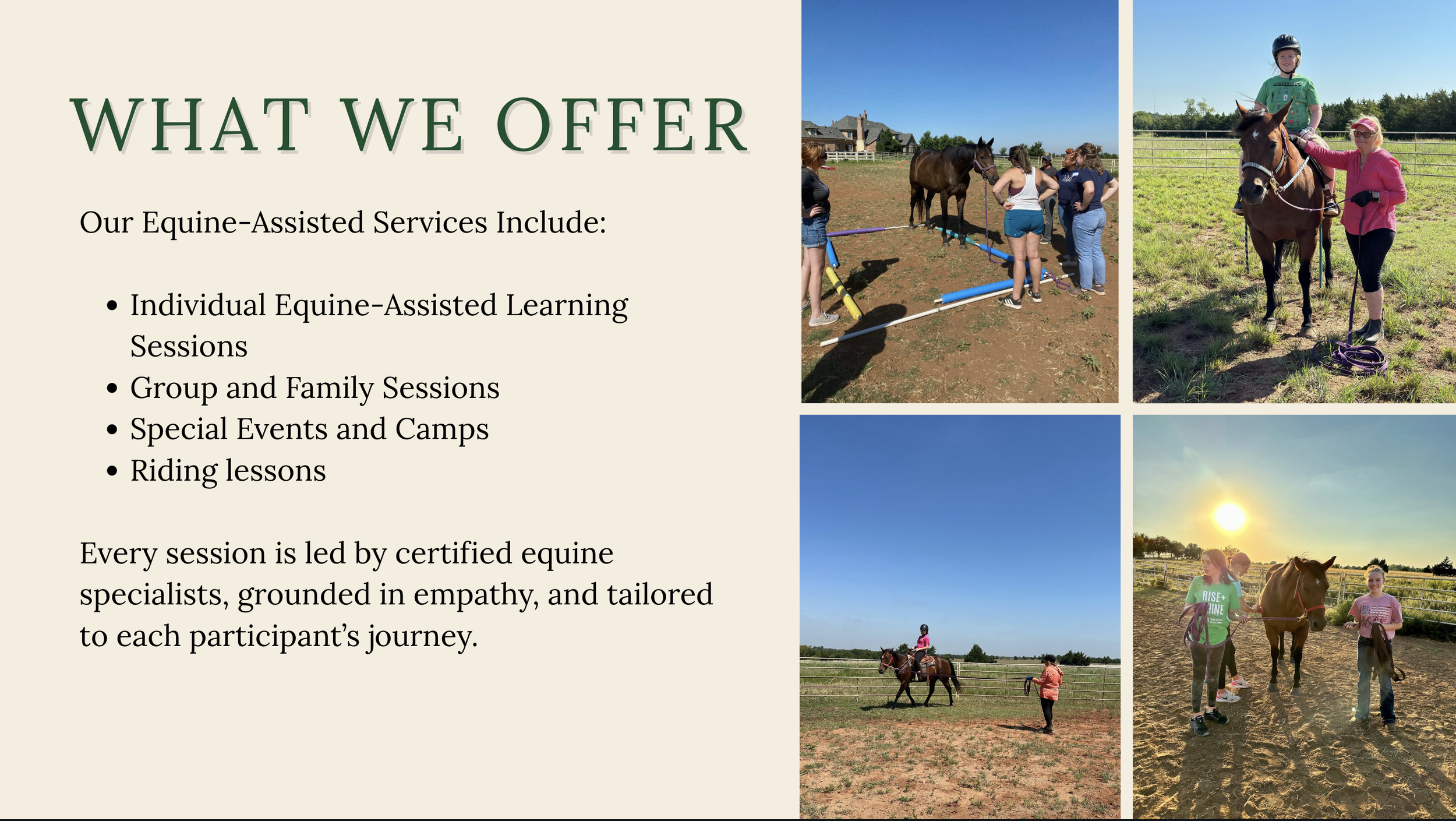 I created this brand strategy slide deck to fully define and launch the identity of Quail Ridge Farm, a space rooted in healing, connection, and emotional growth through equine-assisted learning. From voice and tone to visual identity and messaging, every element was designed to reflect the peaceful, grounded presence of the horses and the transformational experiences they guide. This deck laid the foundation for the website, communications, and long-term brand growth.