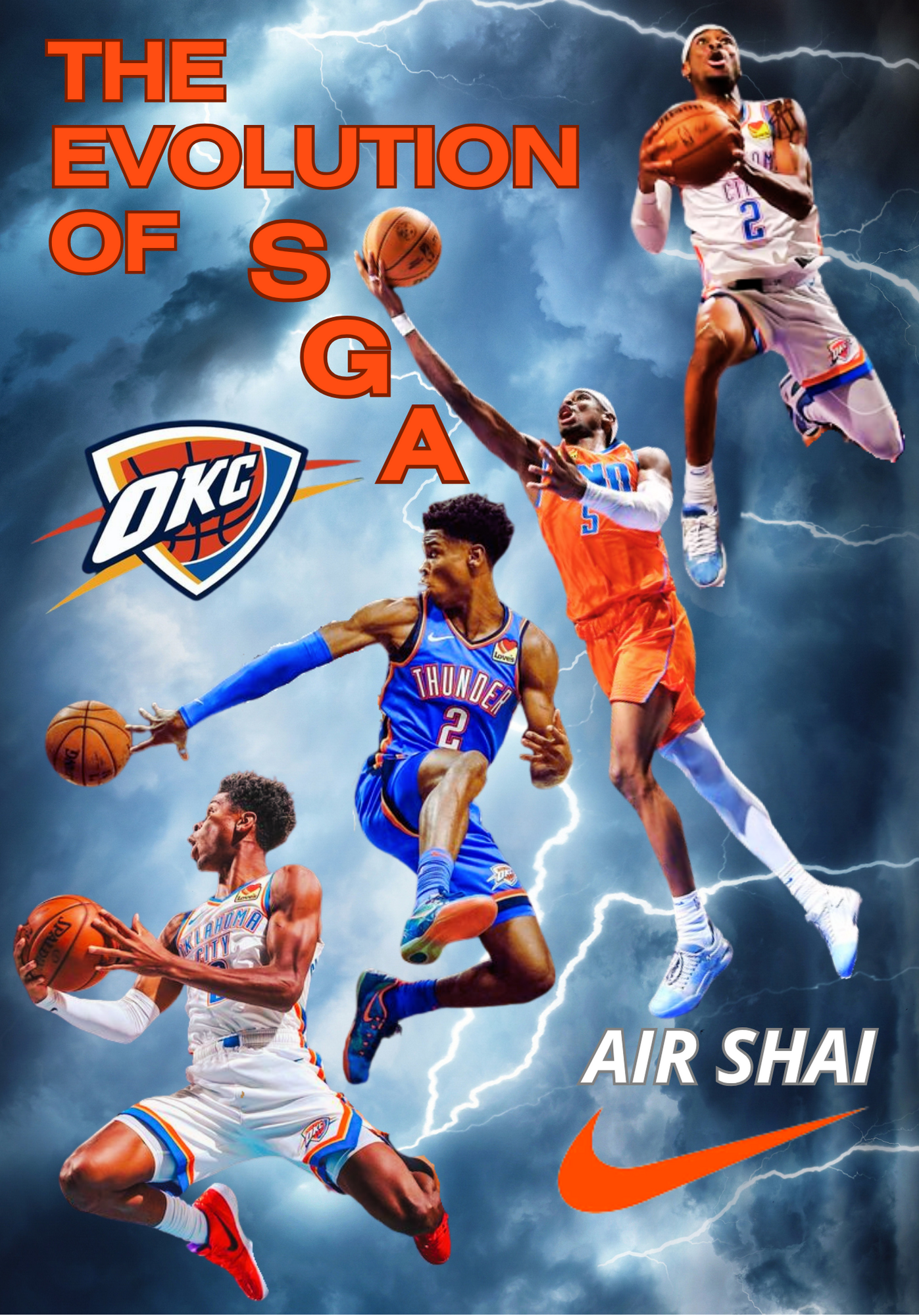 This bold, Nike-inspired poster captures Shai Gilgeous-Alexander's rise through a storm-charged visual narrative. Each action shot highlights a different stage in his career, signaling his growth, while in the air of a stormy sky to represent the power in his jump, which pairs well with “Air Shai,” a tribute to the classic “Air Jordan” era, as well as representing Thunder’s identity itself. Designed to feel like a modern sports campaign, this piece blends a display of growth, movement, and atmosphere, celebrating SGA’s evolution into a true OKC icon.